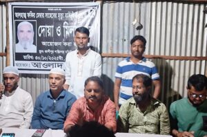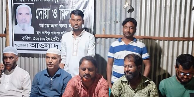 বৃহস্পতিবার ৩০ অক্টোবর বাদ এশা নারায়ণগঞ্জ সদর উপজেলার কাশীপুর ইউনিয়নের শান্তিনগর এলাকায় মতিউর রহমানের গ্যারেজ প্রাঙ্গণে মো. আওলাদ হোসেন এর আয়োজন এ মিলাদ, দোয়া ও নেওয়াজ বিতরণ করা হয়।