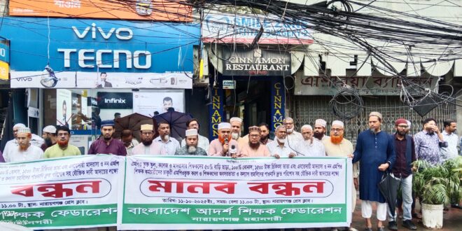শনিবার ১১ অক্টোবর সকাল ১১টায় নারায়ণগঞ্জ প্রেস ক্লাব প্রাঙ্গনে বাংলাদেশ আদর্শ শিক্ষক ফেডারেশন নারায়ণগঞ্জ মহানগরী’র আয়োজনে এ মানববন্ধন অনুষ্ঠিত হয়।