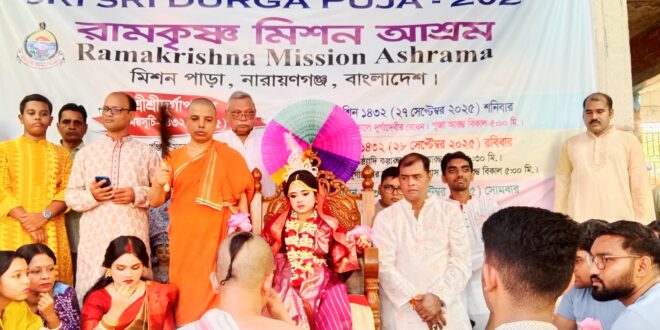 নিউজ ব্যাংক ২৪. নেট : শারদীয় দুর্গোৎসবের মহাষ্টমীর দিনে দেশের বিভিন্ন স্থানে কুমারী পূজা অনুষ্ঠিত হয়েছে। নারায়ণগঞ্জ শহরের চাষাড়াস্থ ঐতিহ্য সম্বলিত রামকৃষ্ণ মিশন আশ্রম মন্দিরে কুমারী পূজা দেখতে রীতিমতো ভক্তদের ঢল নামে।