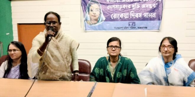 বক্তারা বলেন-বেগম রোকেয়া সাখাওয়াত হোসেন নারী জাগরণ ও নারী শিক্ষার অগ্রদূত। তাঁর জন্ম না হলে এই উপমহাদেশে নারী জাগরণ তথা সামাজিক উন্নয়ন ঘটতে আরো সময় লাগতো। বেগম রোকেয়া ছিলেন একজন বাঙালি লেখক, সমাজ সংস্কারক এবং নারী জাগরণের অগ্রদূত। তার জন্ম ও শৈশব কাটে রংপুর জেলার পায়রাবন্দ গ্রামে এবং তিনি নারীশিক্ষা, নারী অধিকার প্রতিষ্ঠা এবং মুসলিম নারীদের মধ্যে সচেতনতা তৈরিতে গুরুত্বপূর্ণ ভূমিকা রাখেন। তিনি ‘আঞ্জুমানে খাওয়াতীনে ইসলাম’ প্রতিষ্ঠা করেন এবং নারীশিক্ষা প্রতিষ্ঠান প্রতিষ্ঠায় ভূমিকা রাখেন। তার বিখ্যাত কিছু সাহিত্যকর্মের মধ্যে রয়েছে ‘পদ্মরাগ’ ও ‘সুলতানার স্বপ্ন’।