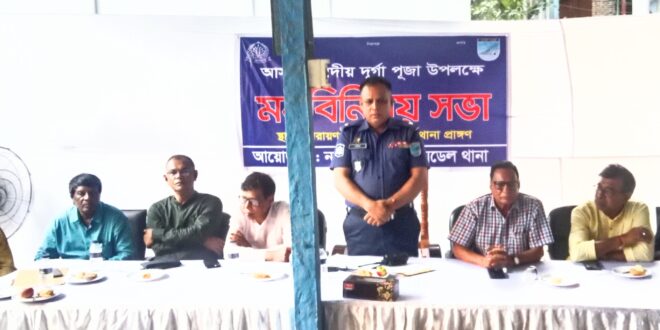 শুক্রবার ২৬ সেপ্টেম্বর বিকাল ৩টায় নারায়ণগঞ্জ সদর মডেল থানা প্রাঙ্গণে বাংলাদেশ পূজা উৎযাপন পরিষদ, পূজা উৎযাপন ফ্রন্ট’র নারায়ণগঞ্জ জেলা এবং মহানগরের নেতৃবৃন্দ ও সদর থানাধীন বিভিন্ন মণ্ডপের নেতৃবৃন্দের সাথে নারায়ণগঞ্জ সদর মডেল থানার আয়োজনে এ মত বিনিময় সভা অনুষ্ঠিত হয়েছে।