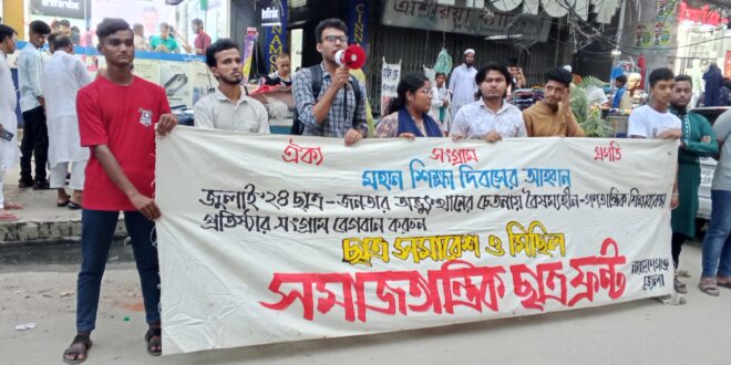 নেতৃবৃন্দ আরও বলেন, শিক্ষার নামে ভর্তি ফি বৃদ্ধি ও নামে-বেনামে ফি আদায় চলছে। ২০-২১ শিক্ষাবর্ষে ফরম পুরণের জন্য অতিরিক্ত ফি নির্ধারণ করা হয়েছিল। শিক্ষার্থীদের পর্যাপ্ত আবাসন, ক্লাসরুম, লাইব্রেরি-সেমিনার কক্ষ, পরিবহন নেই। প্রতিটি কলেজে রয়েছে শিক্ষকের সংকটসহ নানাবিধ সমস্যা। কিন্তু প্রশাসনকে শিক্ষার্থীদের সমস্যা সমাধানে কোনো উদ্যোগ নিতে দেখা যায় না। শিক্ষার এই সংকট বুর্জোয়া শাসকশ্রেণী টিকিয়ে রেখেছে, ফলে বারবার ছাত্র আন্দোলন গণআন্দোলনে রূপ নিয়েছে।